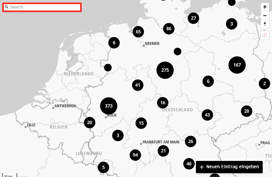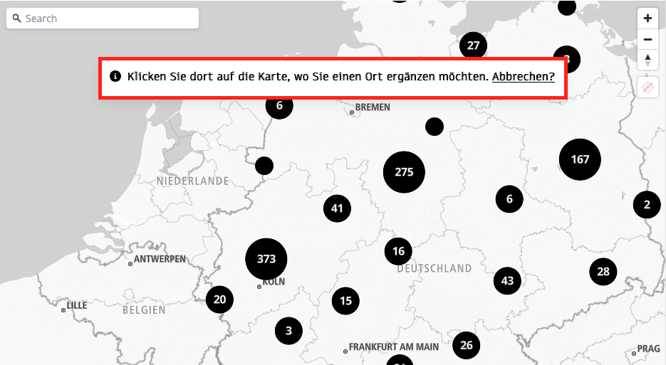 **Hinweis:** Um die Karte nur als statische Ansicht zu verwenden, muss der CrowdNewsroom beendet sein. Solange der CrowdNewsroom aktiv ist, erscheint automatisch ein Button auf der Karte, über den neue Einträge hinzugefügt werden können.