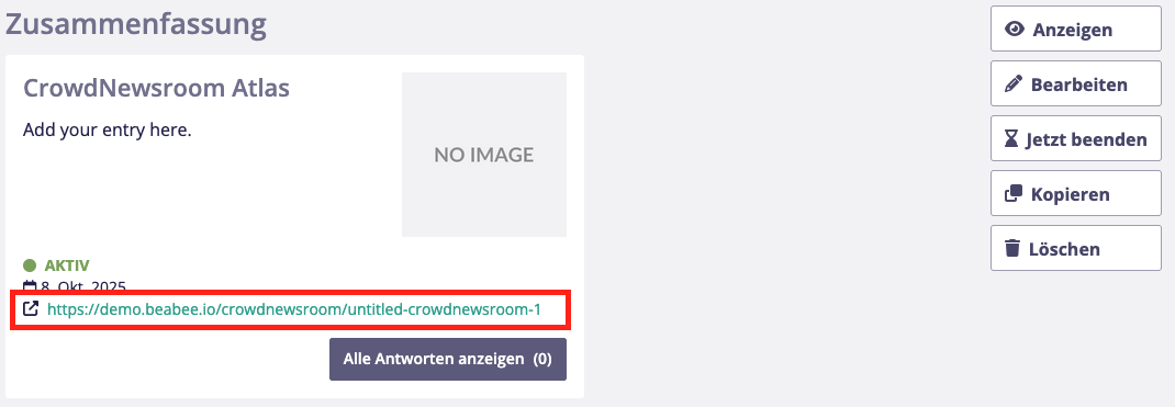 5. Fülle den CrowdNewsroom aus und sende ihn ab. Der Eintrag wird je nach deinen Einstellungen entweder automatisch veröffentlicht oder wartet auf deine Freigabe. Alle über die Karte eingereichten Einträge kannst du wie jede andere Antwort im CrowdNewsroom einsehen, indem du auf den CrowdNewsroom klickst und *Alle Antworten anzeigen* auswählst.