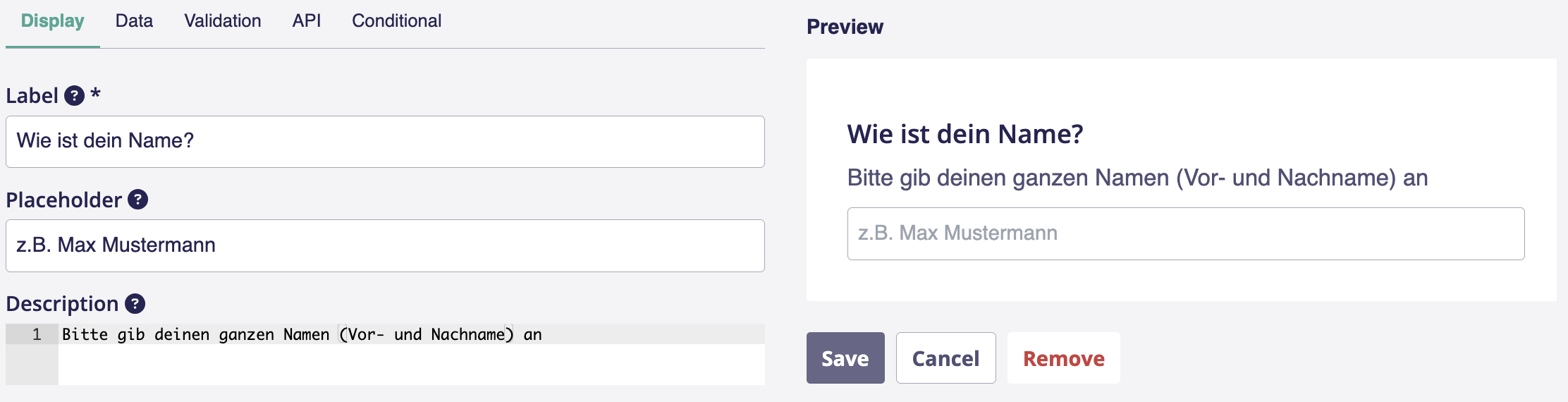 <figure><img src="https://3509003116-files.gitbook.io/~/files/v0/b/gitbook-x-prod.appspot.com/o/spaces%2FFs5SQlVb4f1qwSizSiNn%2Fuploads%2F23IrV0nblwJpRDqDkqrn%2FBildschirmfoto%202025-07-21%20um%2018.43.10.png?alt=media&#x26;token=3afbbe49-752a-4f00-a524-28670eb61319" alt=""><figcaption><p>Im Reiter <em>Display</em> musst du die Frage/Aufgabe formulieren (<em>Label</em>), kannst eine kurze Erklärung hinzufügen (<em>Description</em>) und bei Textfeldern auch einen Beispieltext (<em>Placeholder</em>) einsetzen.</p></figcaption></figure>