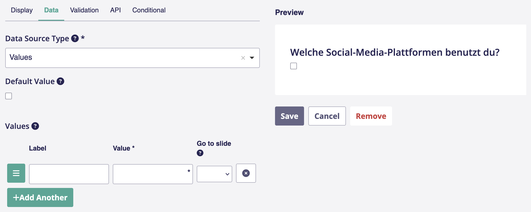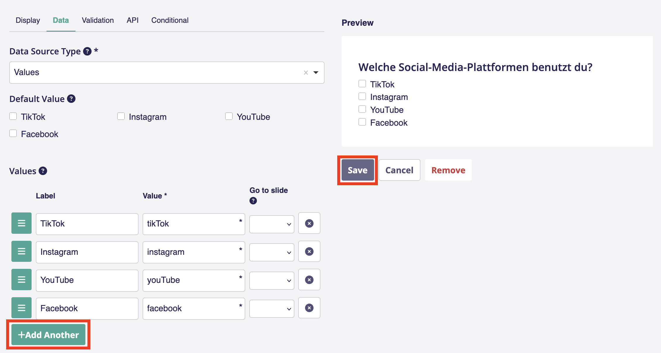 6. Du kannst so viele Antwortmöglichkeiten hinzufügen wie du willst. Dafür klickst du auf *Add Another.* Willst du die Reihenfolge ändern, kannst du das mit dem Button (*drei Balken*) links per Drag & Drop machen. \