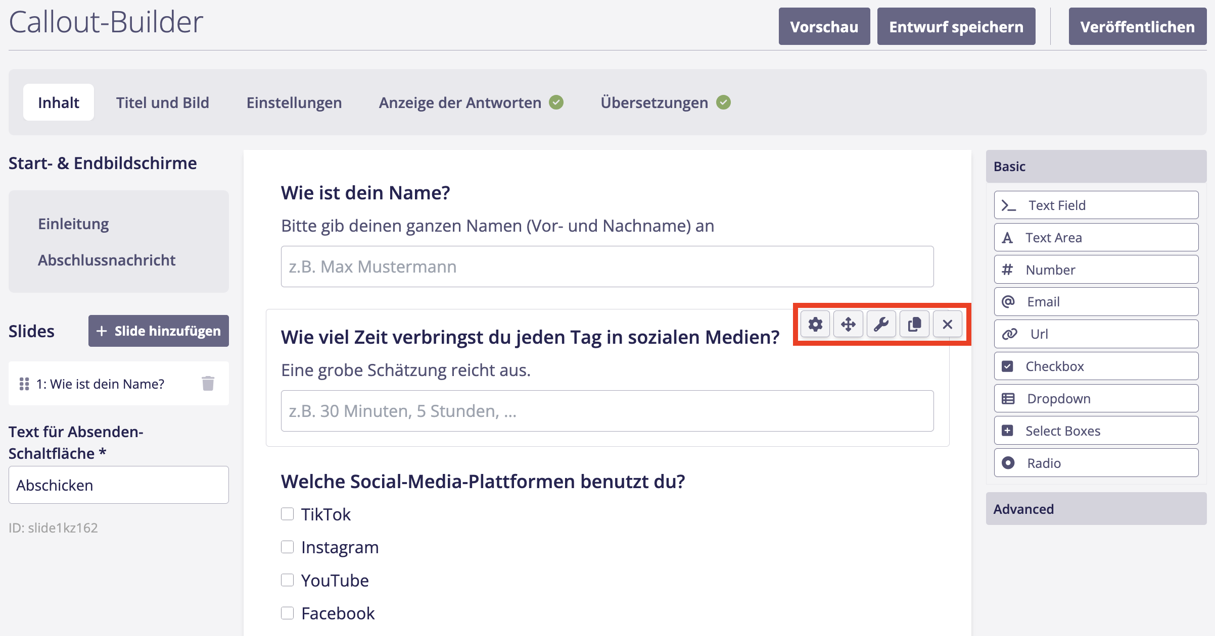 2. Erstelle jetzt deinen Fragebogen, indem du die CrowdNewsroom-Elemente aus der Liste auf der rechten Seite per Drag & Drop zusammenstellst. Die verschiedenen CrowdNewsroom-Elemente werden hier erklärt: [Übersicht: Diese CrowdNewsroom-Elemente gibt es](https://wiki.beabee.io/beabee-help-center/engagement/crowdnewsroom/wie-du-einen-crowdnewsroom-anlegst/crowdnewsroom-inhalt/ubersicht-diese-crowdnewsroom-elemente-gibt-es)