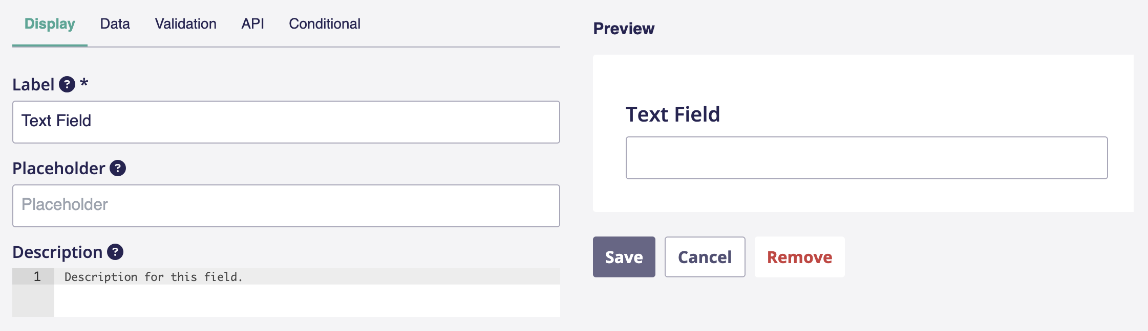 4. In der *Display*-Registerkarte musst du bei *Label* deine Frage oder Aufgabe stellen. Außerdem kannst du eine kurze Erklärung (*Description*) hinzufügen und auch einen Beispieltext für Textfelder (*Placeholder*) bereitstellen.