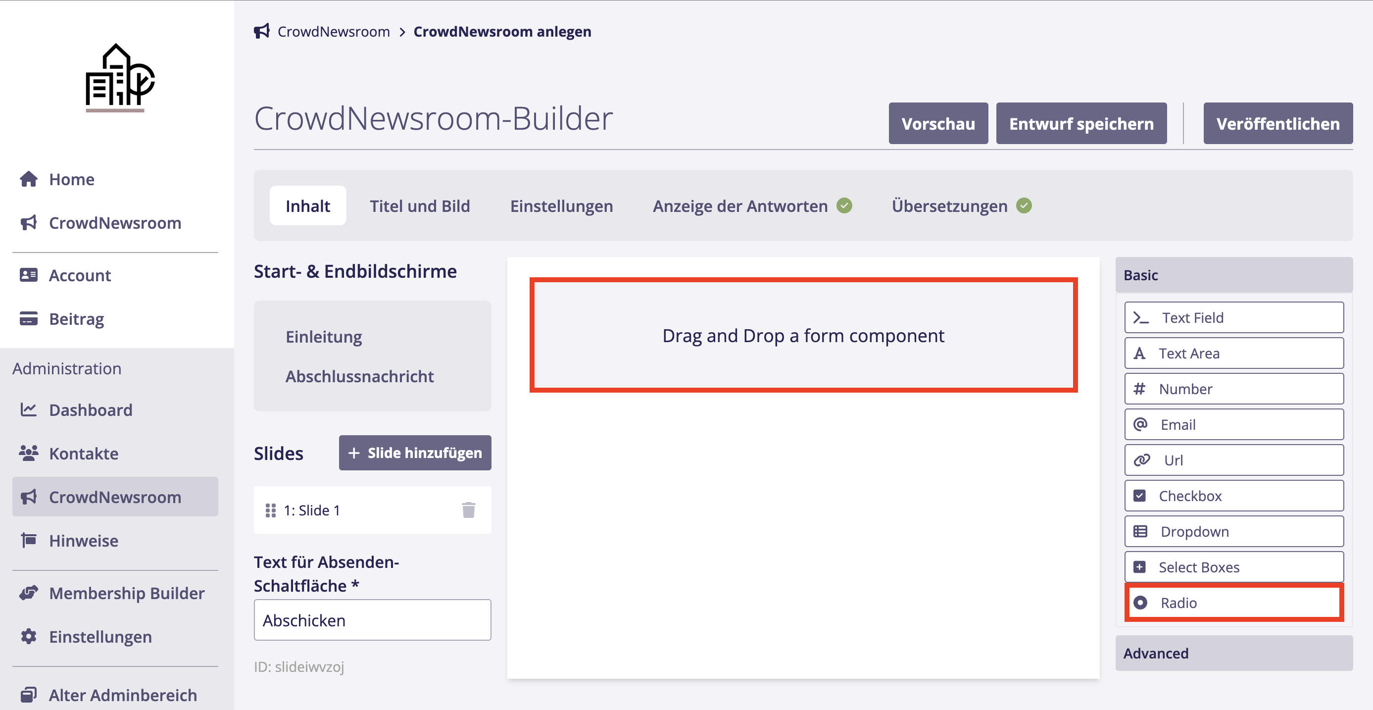 1. Ziehe per Drag-and-Drop das Antwortformat *Radio* in die dafür vorgesehene Fläche.