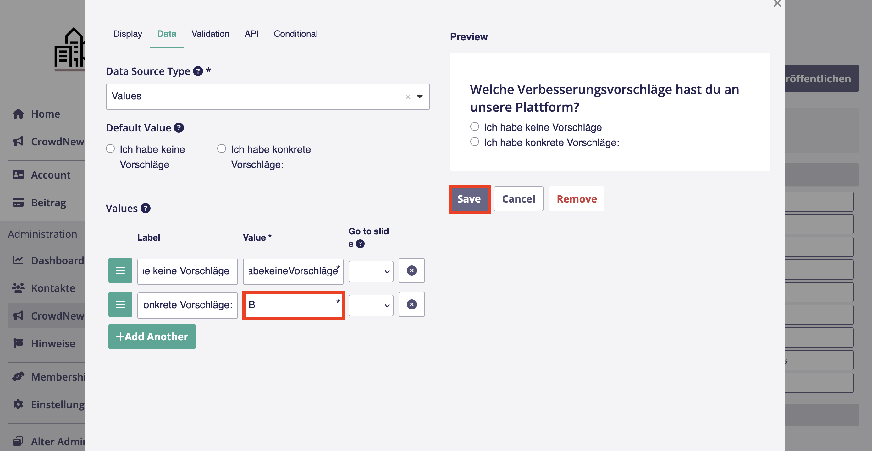 4. Nun trägst du hinter der Antwort, der du ein weiteres Antwortfeld hizufügen möchtest, unter *Value* einen beliebigen Buchstaben ein. Anschließend klickst du auf *Save*.
