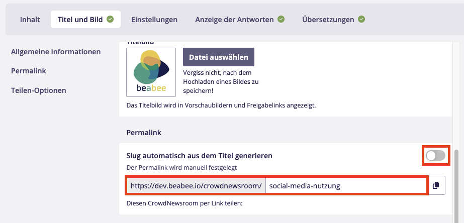 Um die URL eines CrowdNewsrooms anzupassen, gehe im Abschnitt Titel und Bild zu Permalink.