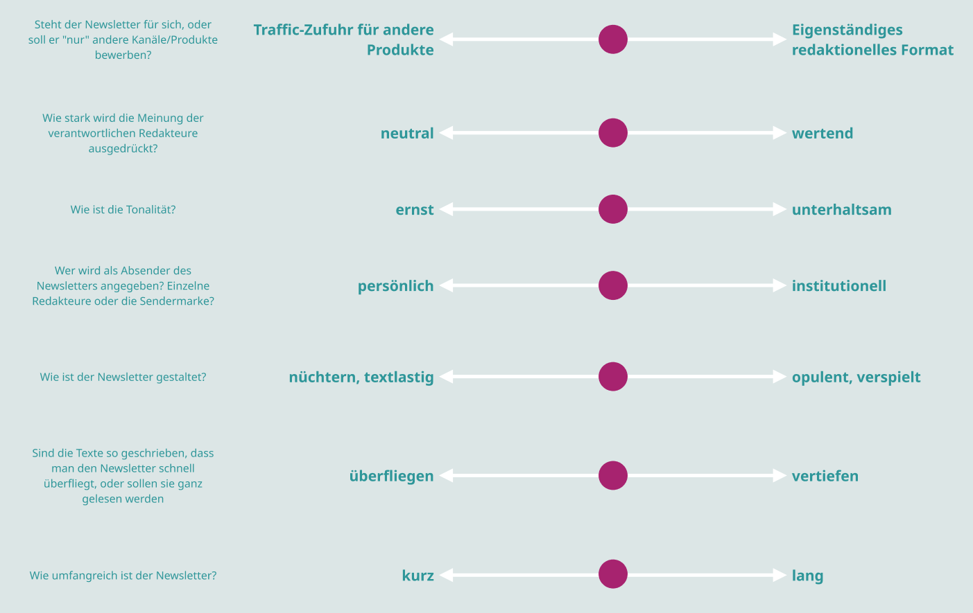 Im zweiten Schritt ist es wichtig, eine klare Strategie zu entwickeln. Lennart Schneider nutzt dafür ein praktisches Tool mit Grundsatzfragen, die zentrale Aspekte wie Tonalität (neutral vs. unterhaltsam) oder journalistische Haltung (wertend vs. objektiv) auf einer Skala abbilden. Durch die Setzung von Punkten wird beschrieben, wo der eigene Newsletter auf dieser Skala eingeordnet werden soll. Diese Visualisierung hilft dabei, für sich selbst oder im Team ein gemeinsames Verständnis und eine konsistente Ausrichtung für den Newsletter zu entwickeln.