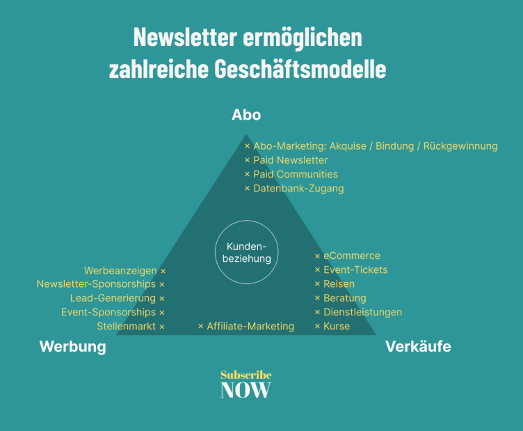 Ein Newsletter ist selten direkt ein Geschäftsmodell – aber er ist ein starkes Fundament für verschiedene Geschäftsmodelle. Durch den regelmäßigen Kontakt mit der eigenen Zielgruppe entstehen Beziehungen, die sich auf unterschiedliche Weise monetarisieren lassen: etwa durch Abos, Mitgliedschaften, Werbung oder Einzelverkäufe wie Beratungsleistungen oder Kurse. Lennart Schneider empfiehlt, sich vor allem zu Beginn nicht nur auf ein einziges Geschäftsmodell zu verlassen, sondern breit aufgestellt zu starten und verschiedene Einnahmequellen zu testen.