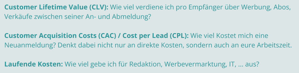 Ein Beispiel: Wenn ein Leser oder eine Leserin durchschnittlich 5 Euro Umsatz bringt und die Akquise 3 Euro kostet, ist dein Modell profitabel.&#x20;